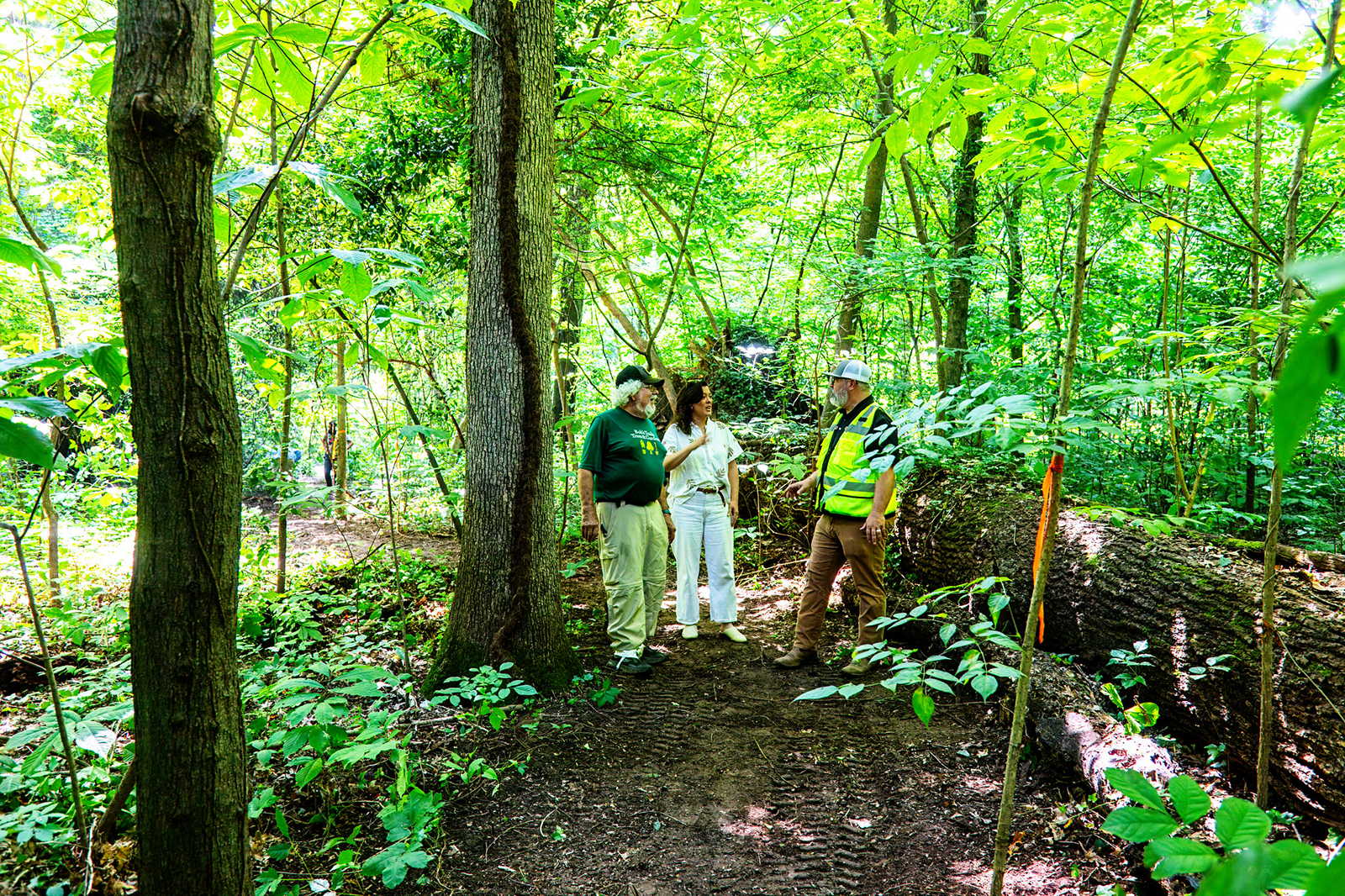 Overton Park Conservancy Executive Director Kaci Murley tours the new trail with Bob Richards of Bob’s Trails, Trees & Gardens and Jim Suggs of Alliant Construction