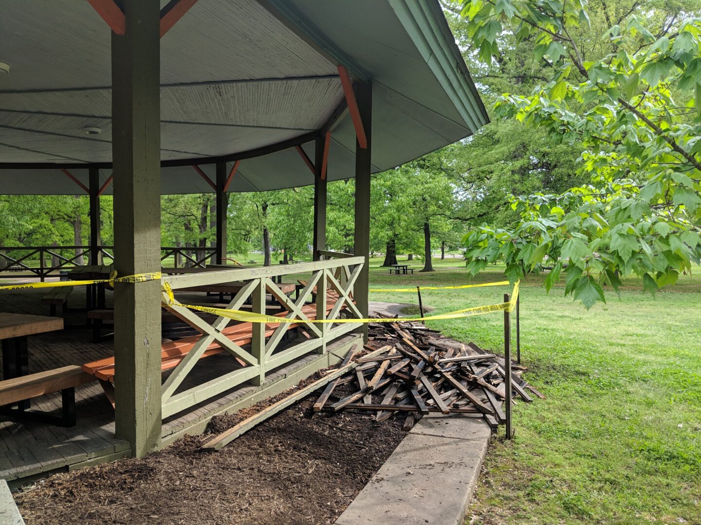 The Conservancy has engaged Wagner General Contractors to make repairs to the pavilion that will make it safe for our park users. The $16,000 repairs will use pine wood to patch the floors. We estimate that the pavilion will be operational by the end of May, but until then, it is not safe to use.