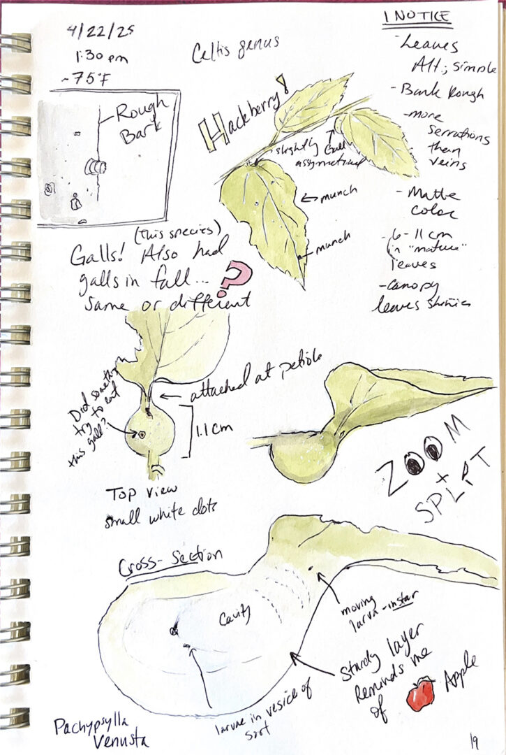 The gall structure can be large and obvious, like the gouty oak galls you’ve likely seen on an oak in your neighborhood, or the particularly gouty red oak tree behind Hole 1 on the golf course. It also may be something unassuming and incredibly ephemeral, like this Hackberry Winged Gall Midge. This small, oddly shaped gall was gone mere days after I observed it. Whatever form it comes in, the gall’s design and timing makes it a reliable indicator for the species of inducer. This is called a secondary or extended phenotype. Absolute biological wizardry if you ask me!